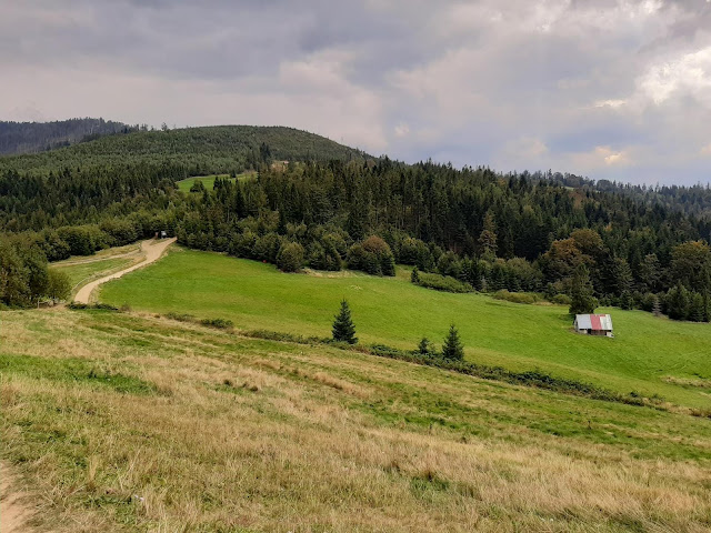 Następnie ruszamy dalej żółtym szlakiem. Nasza trasa wiedzie przez widokowe hale: Halę Bieguńską, Halę Gawłowską, Halę Bacmańską i Halę Redykalną, chmury się trochę podnoszą i coś widać dalej, a ja przysiadam na chwilę na jednej z hal popatrzeć na widoki. Hale w Beskidach niegdyś tętniły życiem pasterskim. Pasterstwo w Beskidach pojawiło się wraz z osiedlaniem się Wołochów na terenie gór. Wołosi wędrowali z Półwyspu Bałkańskiego w kierunku północnym, na ziemiach polskich osiedlali się od XIV w. Koczowniczy lud zajmował się pasterstwem owiec, pozyskiwał nowe hale metodą żarową, a więc poprzez wypalanie lasów. Produkował produkty owcze: mleko, skóry i wełna. Zimą schodzili w doliny i zakładali osady, późniejsze wsie. Tradycyjnie pasterstwo każdego roku zaczynało się redykiem 23 kwietnia (św. Wojciecha), wówczas bacowie wyprowadzali owce na hale i rozpalali ogień - watry w szałasie, wierzono bowiem, że ogień odpędza wszelkie złe moce i siły nieczyste. Watra nie mogła zgasnąć przed wigilią św. Jana, czyli 24 czerwca. Za ogień odpowiedzialny był sam baca. Życie pasterskie na halach toczyło się do święta św. Michała Archanioła – 29 września. Wówczas odbywał się osod (redyk jesienny) czyli zejście pasterzy z owcami z gór w doliny na zimę. Szacuje się, że w okresie największej świetności pasterstwa na halach Beskidu Żywieckiego wypasało się 60 tys. owiec każdego roku. Po II wojnie pasterstwo trwało nadal, jednak pod koniec lat 80. XX w. nastąpił nagły spadek pogłowia. Spowodowane to było przemianami gospodarczymi, produkty owcze stały się niepotrzebne na rynku, pasterstwo stało się nieopłacalne, owce niemal zniknęły z hal. Kilkuset letnie tradycje zaczynają zanikać, zarastają też hale i giną typowe dla hal gatunki roślin. W ostatnich latach powoli wraca się do pasterstwa, jednak ma ono często charakter kulturowy, jako atrakcji dla turystów. Codzienny niegdyś widok owcy na beskidzkich halach dziś należy do rzadkości. Mi podczas tej wędrówki nie udało się spotkać żadnej.